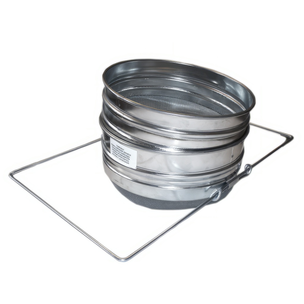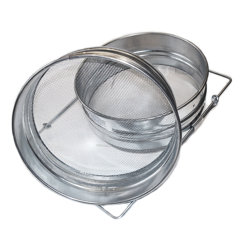 Mézszűrő 21 cm átmérővel. A szűrő dupla rétegű, domború és ónozott. Állítható fogantyúkkal rendelkezik.