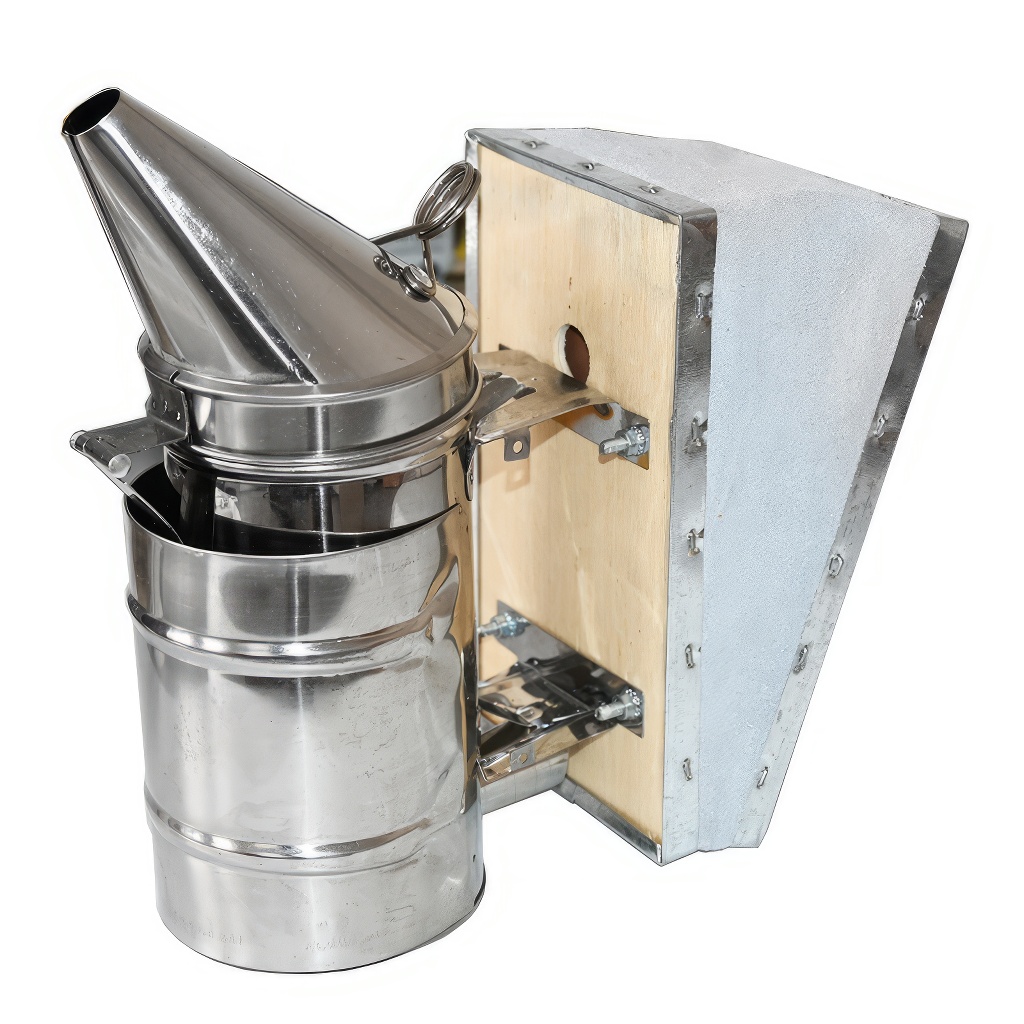 Méhészeti füstölő rozsdamentes acélból, könnyen üríthető hamutartó betéttel. Égési sérülések elleni biztonsági ráccsal és akasztóhoroggal van ellátva. Minőségi bőr fújtató.