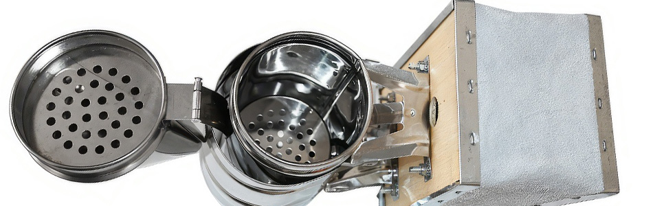 A modell kerületén védő drótráccsal van ellátva, amely korlátozza az érintkezést a felforrósodott burkolattal és megvédi a kezet és a ruházatot az égéstől. Belül perforált betét található a megfelelő légáramláshoz, stabil parázsáláshoz és a hamu könnyebb kiürítéséhez munka után. Nem hiányzik a praktikus akasztó sem – a füstölőt biztonságosan el lehet helyezni a kaptárépítményen vagy fel lehet akasztani műhelyben való tároláskor.